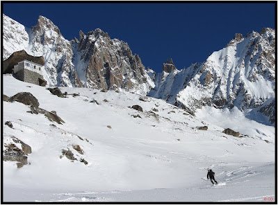 Après quelques hésitations sur les Dômes de Miage (peut-être trop haut, trop venté, trop tôt en saison ...) notre choix se porte finalement sur le refuge du Couvercle et le bassin de Talèfre. Pour l'objectif du 2ème jour, on se dit qu'on verra sur place, en fonction des conditions de neige, de notre état physique ... Au mieux, on ira au col de la Tour des Courtes, au minimum, on se promènera sur le glacier !! Pas de couloir au programme, donc Jérôme est aussi du voyage. Quant à Bougnat, il parait qu'il se ressource en Auvergne !